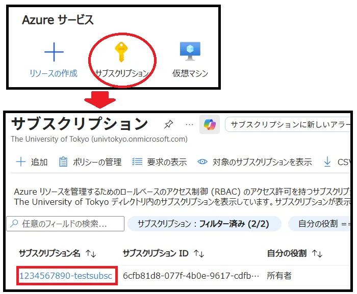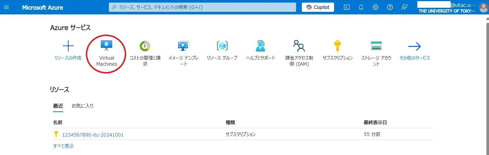 Azure portalUTokyo Accountでログインし、リソースの欄にサブスクリプションがない場合(下図参照),先に以下のURLからサブスクリプションを申請してください.